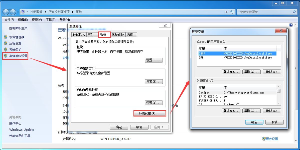 - 点击”高级系统设置”,在系统属性对话框的高级页签中选择”环境变量”