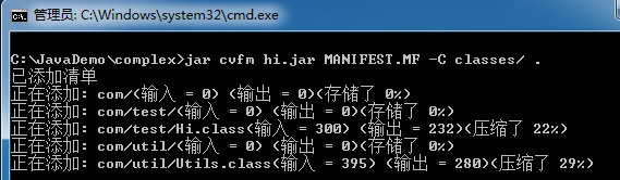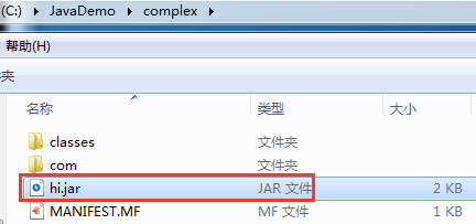 将complex目录中com文件夹编译后的classes目录中的所有文件打包到hi.jar中:
