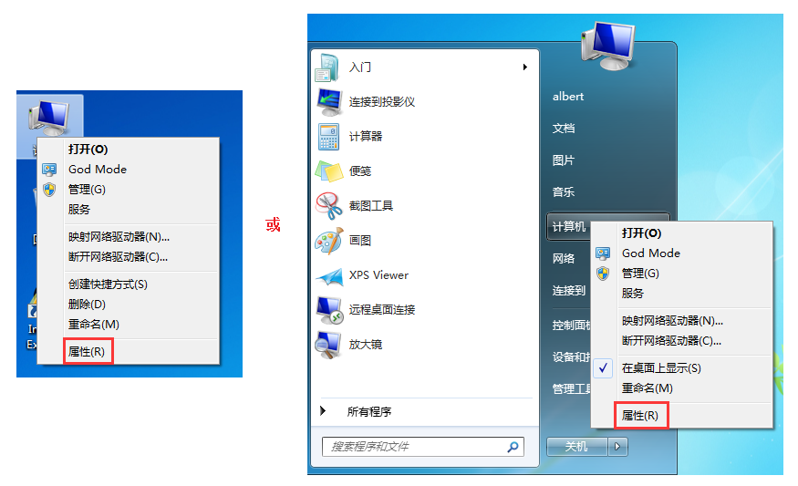 Win + Pause组合键或在”桌面计算机图标”上右键选择”属性”:
